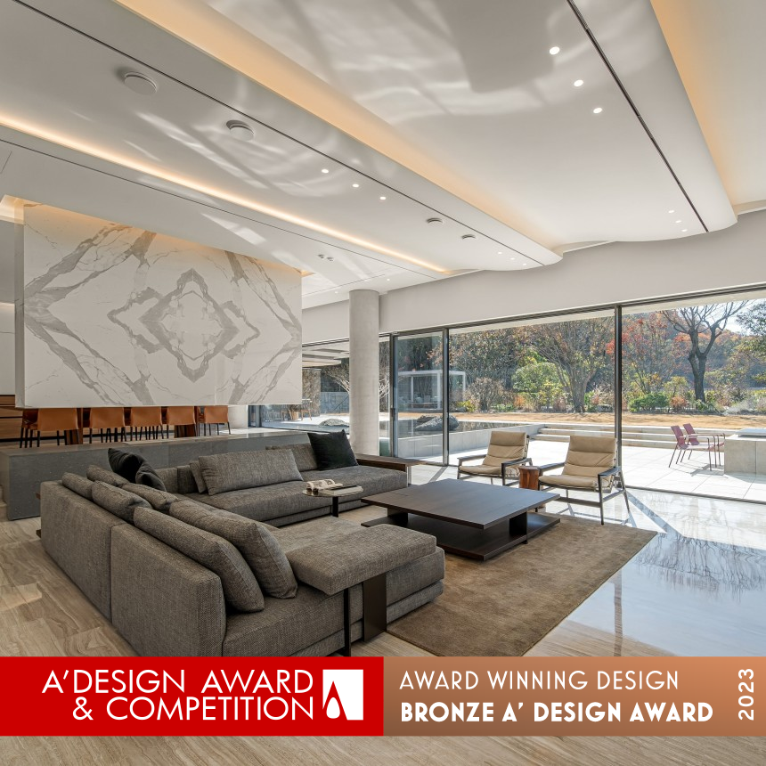 View Design DetailsThe Wave House project is a unique case that started with an interior design based on the concept of a view, and expanded the design scope to include the landscaping design, which is the subject of the view, as well as the front yard and wall connected to the building, and the landing part of the garden stairs. We tried to understand the formativeness and principles of architecture, and focused on naturally connecting this to the interior. In addition, we considered the front yard as the middle area in the relationship between the building and the landscape, and interpreted it as the concept of an outdoor living room that is connected to the same level as the interior. In this outdoor living room, users can experience devices that contain natural objects such as water and fire with artificial structures such as a mirror pond and a fire place, and furthermore, we planned it in stages so that they can experience a rest closer to nature in the pergola, which is located in a small forest of grass and trees.