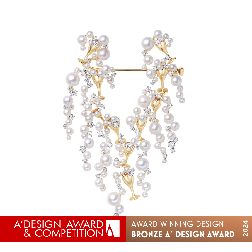 The overall shape of this brooch is a large wine glass, which in turn has various shapes of shot glasses. The shot glasses represent every moment of celebration, and the akoya pearls represent the bubbles rising from the wine, a series of bubbles dancing as excitedly as those people raising their glasses. This is a soft, lightweight brooch with pearl bubbles that can swing. The back of the brooch is also a wine glass with bubbles flowing, as if you are drinking a glass at this moment.